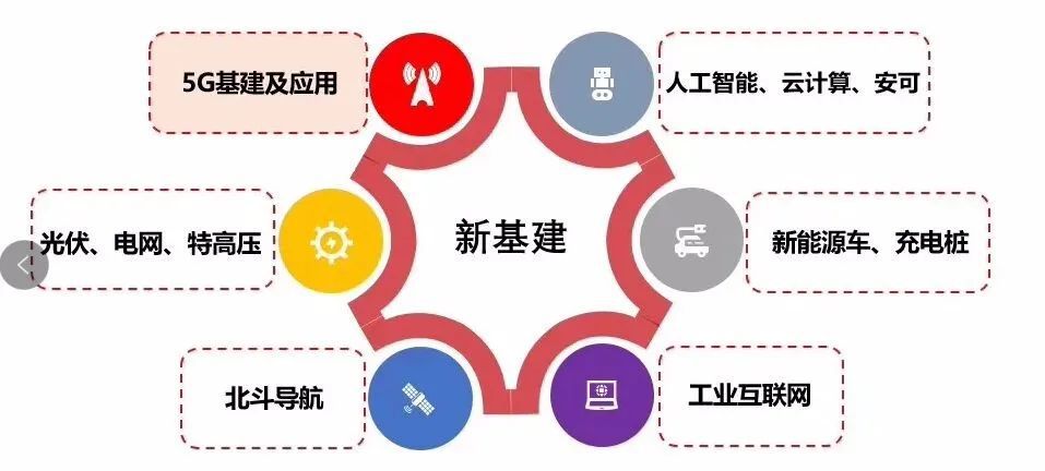同时还有部分观点将其分类为信息网、交通网和能源网,5G基站建设、大数据中心、人工智能、工业互联网为信息网;高铁、城轨、城际为交通网;特高压、新能源汽车充电桩、智能电网为能源网。